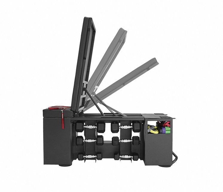 El Banco funcional de AFW es un equipo versátil que brinda un soporte ideal para realizar una amplia variedad de ejercicios, adaptándose a las necesidades y preferencias de cada usuario. Además de su funcionalidad principal, este banco cuenta con diversos espacios de almacenamiento que permiten guardar de manera ordenada y accesible el equipo utilizado en los entrenamientos, como cuerdas de saltar, elásticos, cuerdas, etc. También incluye un anclaje para el entrenamiento con cuerda y elástico. El banco ofrece espacio de almacenamiento para 6 pares de mancuernas, con agujeros específicos para kettlebells y slam balls. Para mayor comodidad, cuenta con ruedas y asas que facilitan su transporte. Fabricado en acero Q195, garantiza resistencia y durabilidad. Cabe destacar que los complementos no están incluidos.