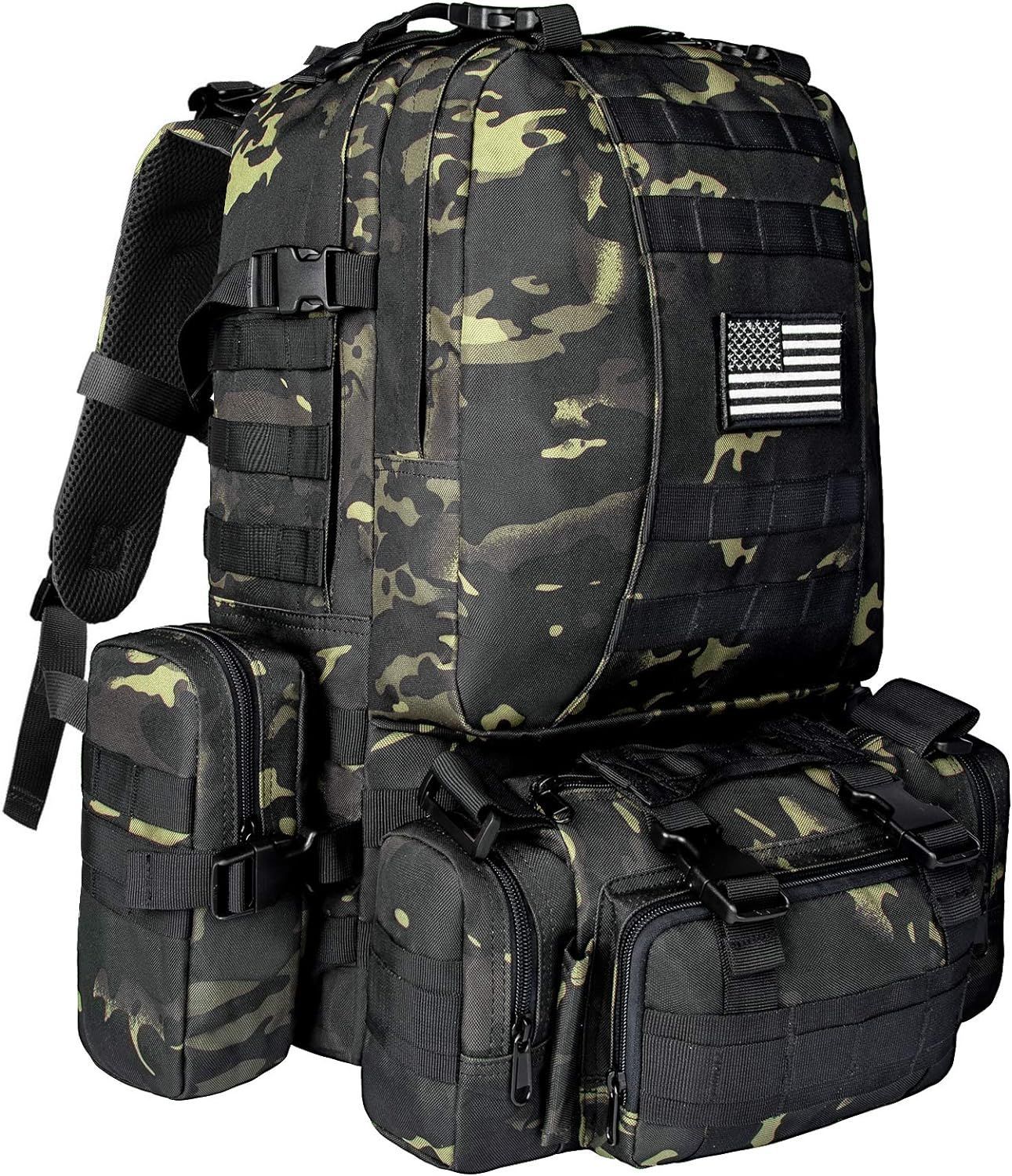 • La espaciosa mochila militar tiene un compartimento principal grande, una bolsa frontal desmontable que se puede utilizar como una cangurera táctica por separado, dos bolsas laterales desmontables tácticas que se pueden utilizar como bolsas de primeros auxilios. Esta mochila multiusos se puede considerar de forma flexible como una mochila de 50 L y 60 L.