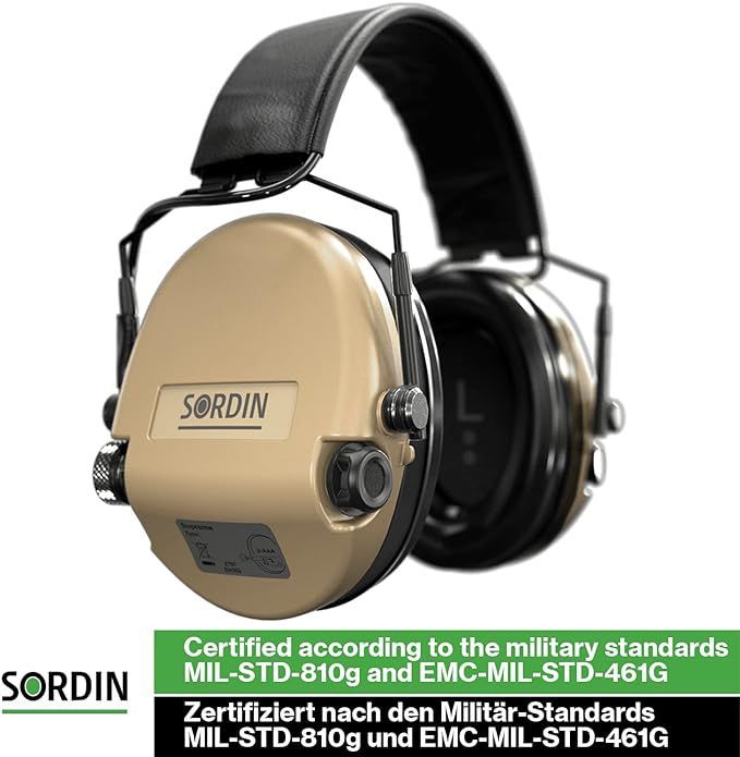 Los modelos Sordin Supreme TM MIL AUX SFA TM han sido probados según partes relevantes de los estándares MIL-STD-810G y MIL-STD-810H .