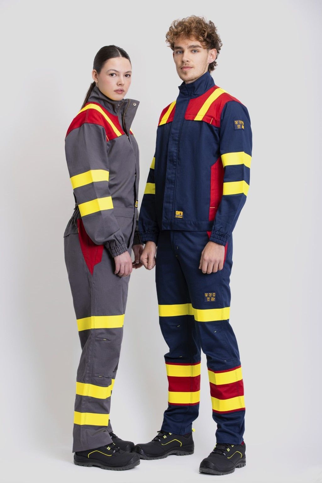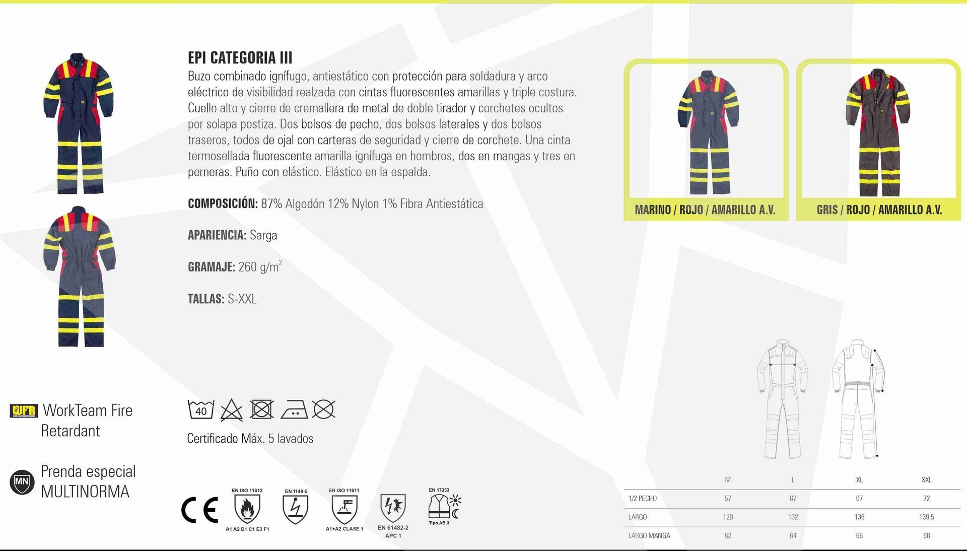Buzo combinado ignífugo, antiestático con protección para soldadura y arco eléctrico de visibilidad realzada con cintas fluorescentes amarillas y triple costura. Cuello alto y cierre de cremallera de metal de doble tirador y corchetes ocultos por solapa postiza. Dos bolsos de pecho, dos bolsos laterales y dos bolsos traseros, todos de ojal con carteras de seguridad y cierre de corchete. Una cinta termosellada fluorescente amarilla ignífuga en hombros, dos en mangas y tres en perneras. Puño con elástico. Elástico en la espalda.