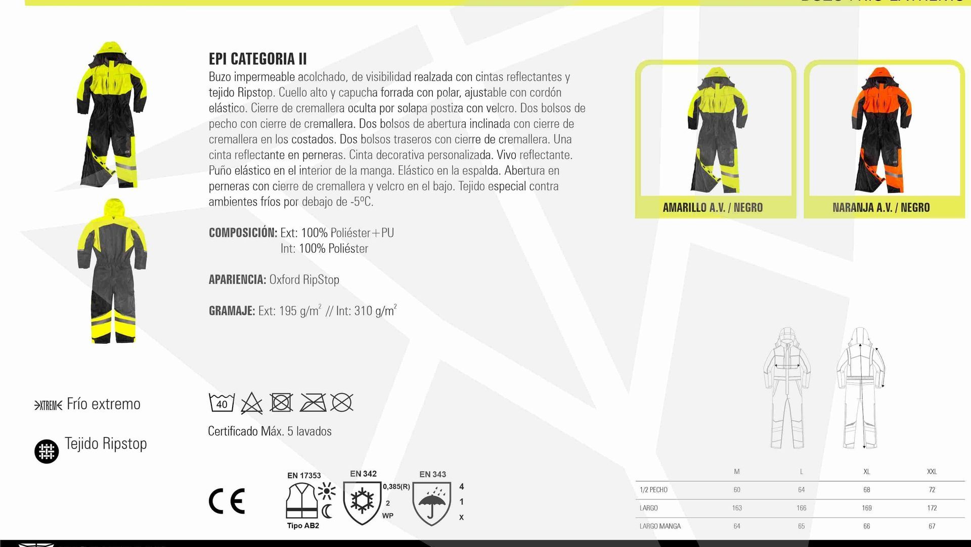Buzo impermeable acolchado, de visibilidad realzada con cintas reflectantes y tejido Ripstop. Cuello alto y capucha forrada con polar, ajustable con cordón elástico. Cierre de cremallera oculta por solapa postiza con velcro. Dos bolsos de pecho con cierre de cremallera. Dos bolsos de abertura inclinada con cierre de cremallera en los costados. Dos bolsos traseros con cierre de cremallera. Una cinta reflectante en perneras. Cinta decorativa personalizada. Vivo reflectante. Puño elástico en el interior de la manga. Elástico en la espalda. Abertura en perneras con cierre de cremallera y velcro en el bajo. Tejido especial contra temperaturas inferiores a -5ºC.