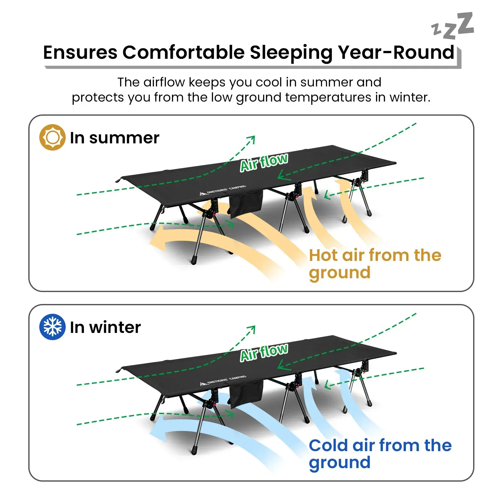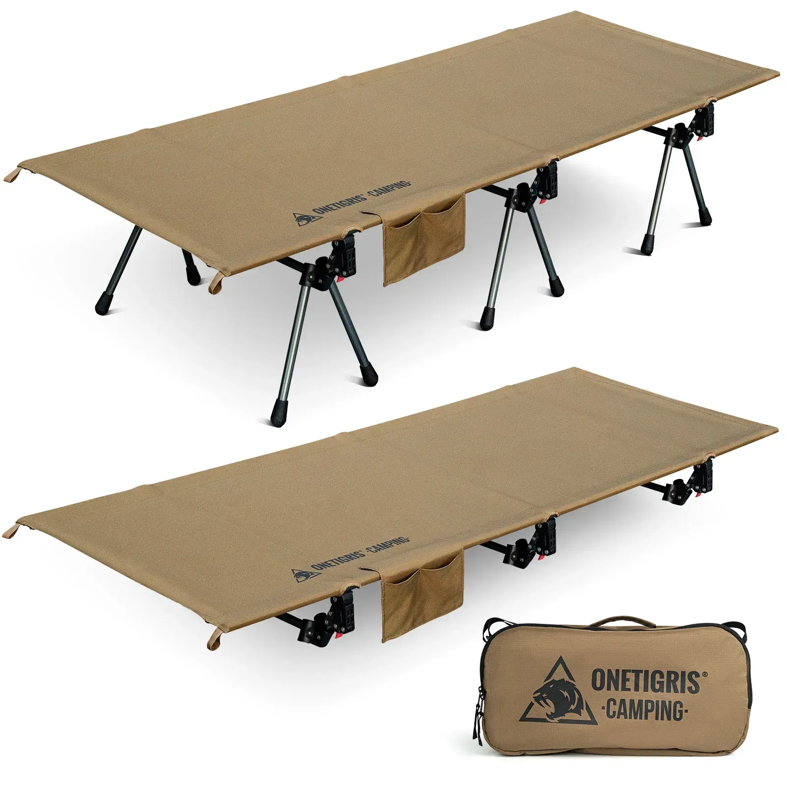 Esta cama se puede usar en terrenos irregulares sin tener que invertir mucho tiempo en elegir el lugar perfecto para acampar. El nuevo diseño de la estructura de varillas facilita la instalación de las patas, incluso para una niña pequeña. Combinado con el aluminio de grado aeronáutico, el cuerpo superrígido soporta hasta 150 kg (330 lb) de peso. El diseño de las patas extendidas permite ajustar la cama a un nivel alto o bajo según tus necesidades. Está disponible en marrón coyote para quienes buscan algo discreto y económico. Los entusiastas de las actividades al aire libre apreciarán la simplicidad y el precio asequible de este kit que ofrece comodidad, practicidad y un excelente estilo para disfrutar de la naturaleza.