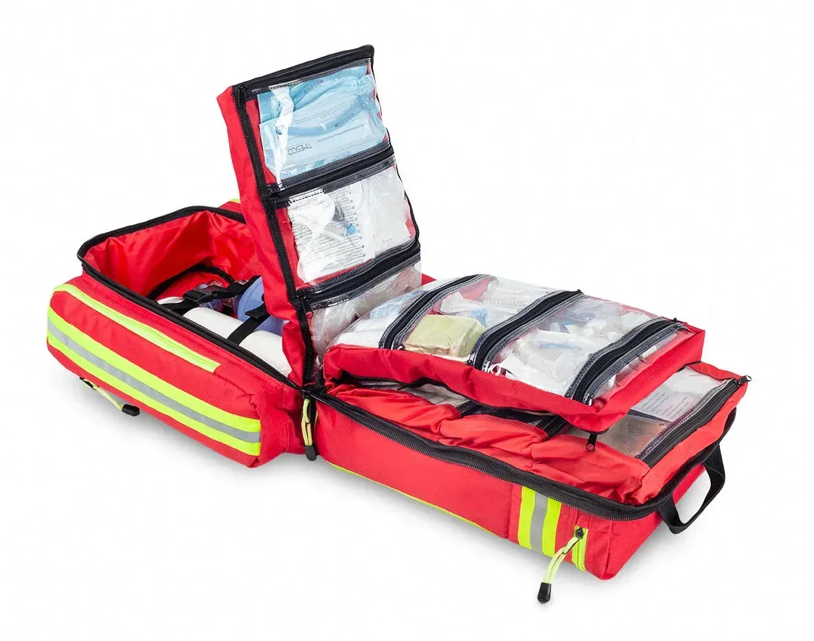 Mochila para primeros auxilios diseñada pensando en la primera intervención para conciertos, eventos deportivos o religiosos, fabricada en 600D Poliéster, material resistente de excelente calidad y durabilidad, su compartimiento principal dispone de cremallera periférica, permite una apertura total de la mochila y facilita el acceso rápido a los suministros. Además, cuenta con bolsillos externos frontales, lengüetas centrales, cuerpos laterales de gran longitud, toma de constantes, zona extra con bandas elásticas y cintas de ajuste permiten una distribución y organización estratégica del material para una atención eficaz en el menor tiempo posible. Incluye funda protectora. Indicada para personal de salud, sanitarios, rescate, de seguridad. Disponible en color rojo.
