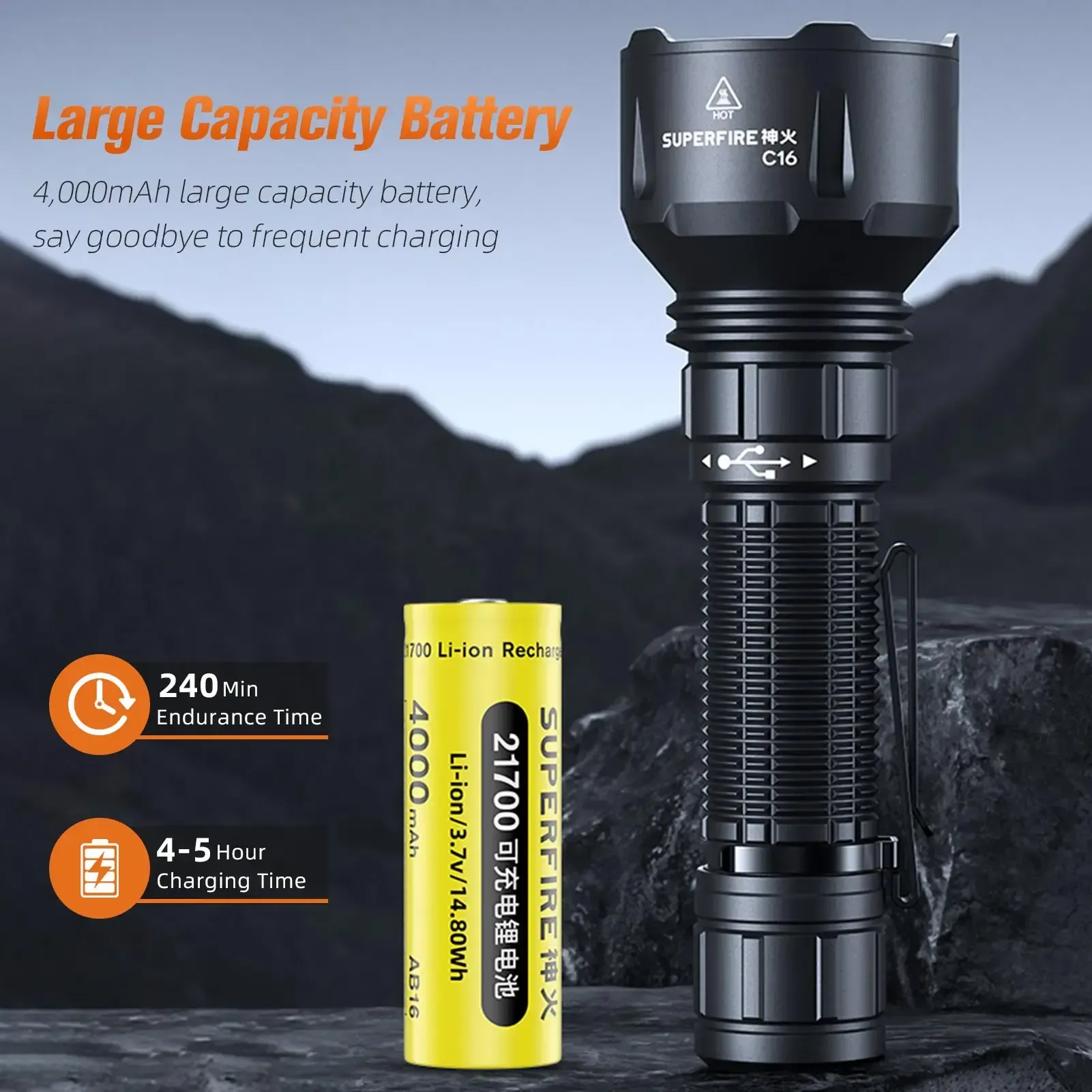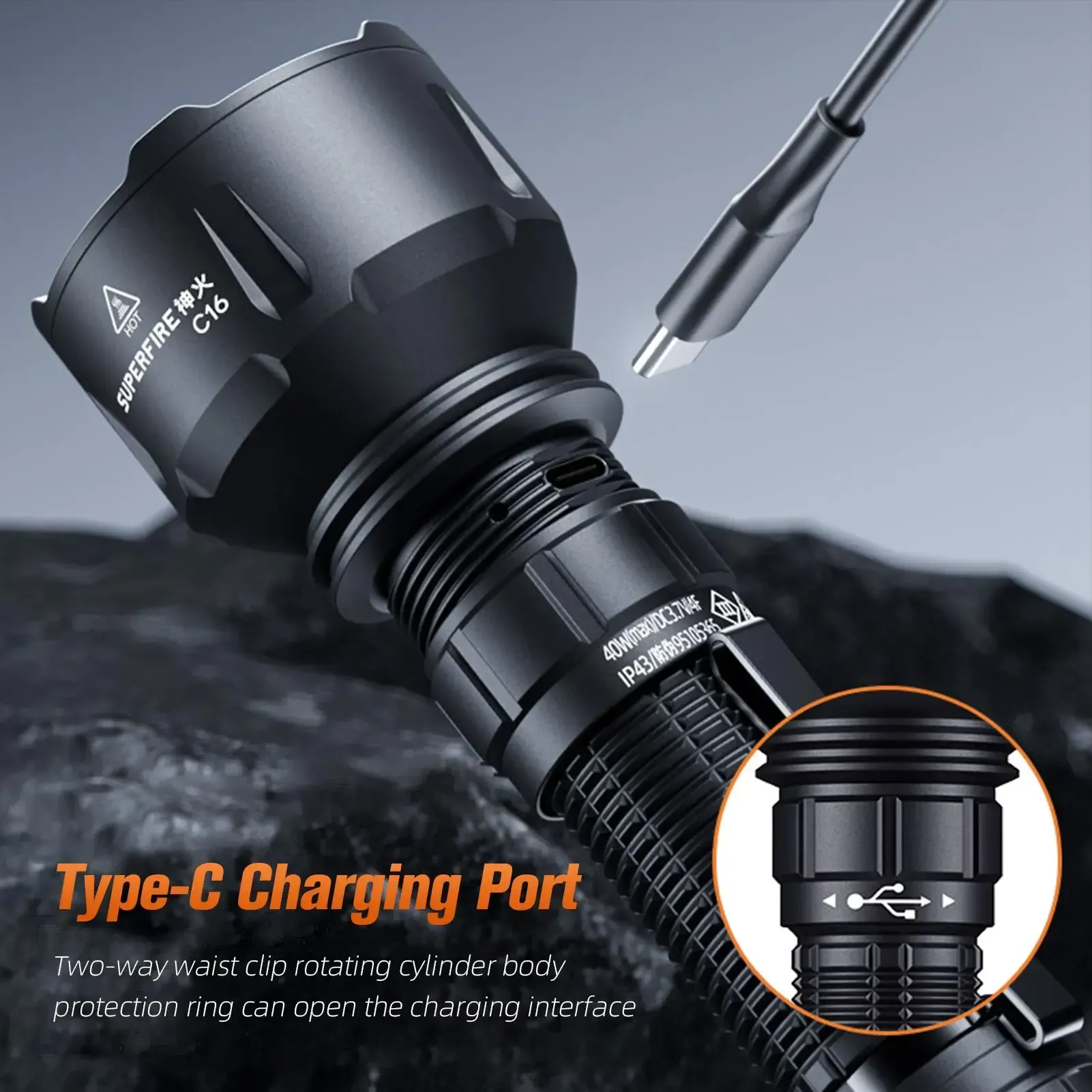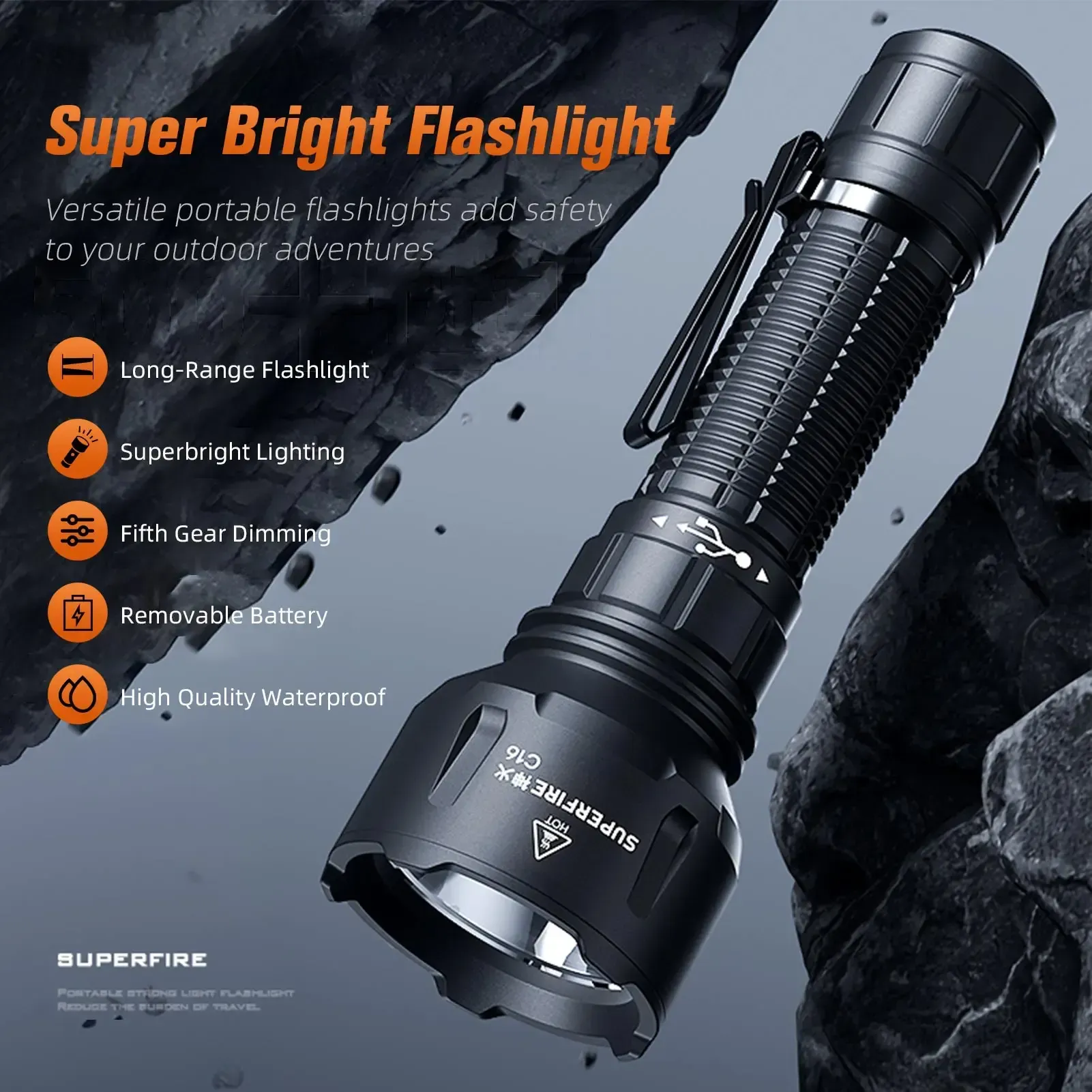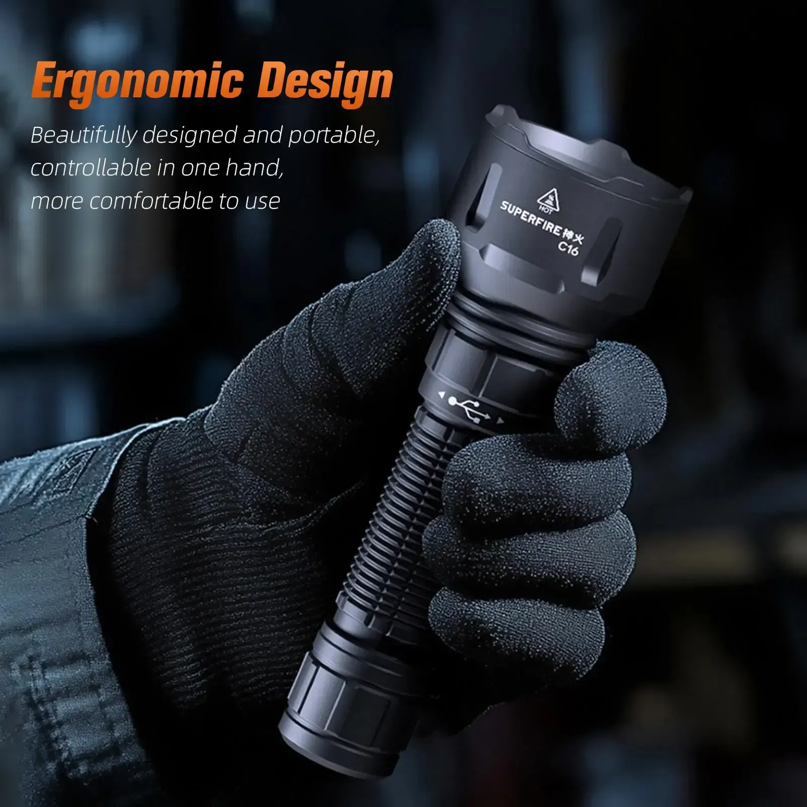 Gracias a su cuerpo de aleación de aluminio resistente, peso ligero y dimensiones prácticas, la linterna se maneja cómodamente con una sola mano y es perfecta para llevarla contigo. La Supfire C16 combina potencia, durabilidad y compacidad en un diseño elegante.
