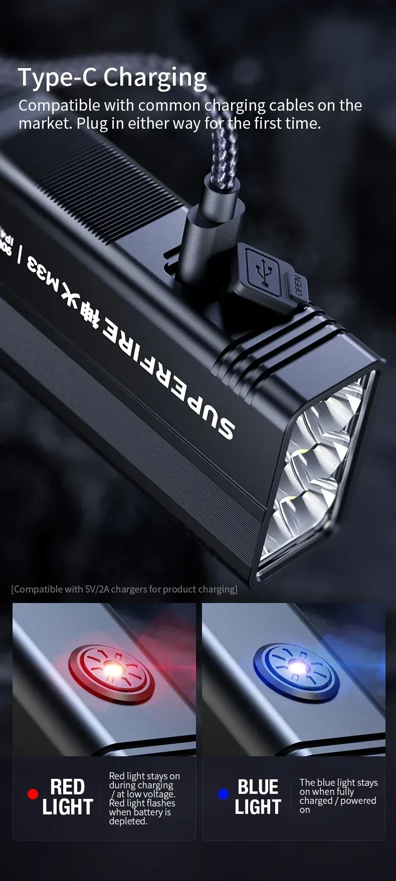 Niveles de potencia: Luz baja, Luz media, Luz alta, Estroboscópica, SOS/Luz extrema